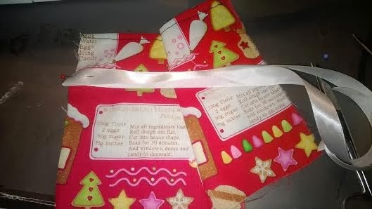 Dann Steckt Ihr zwischen den Stofflagen das Schleifenband Fest, so dass Ihr später zwei Bänder habt, aus denen Ihr eine Schleife Binden könnt. Lasst nach oben hin etwas Platz, das sieht zusammengebunden hübscher aus.