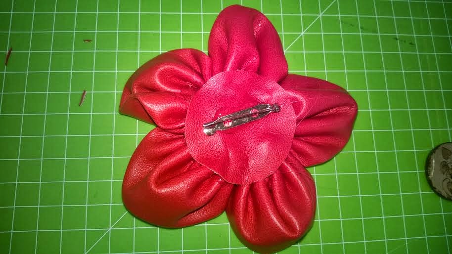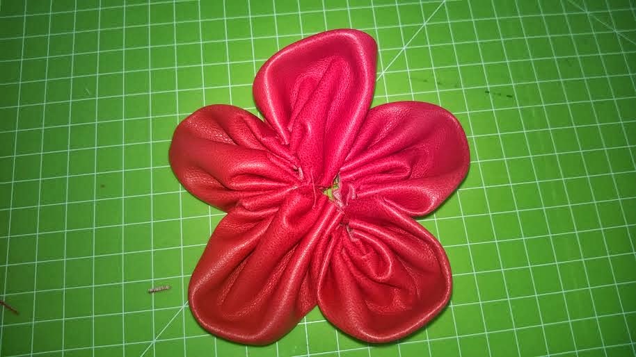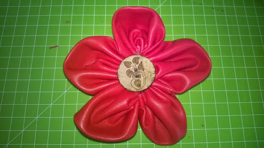 - 5 Stoffquadrate (Ich habe hier Kunstleder verwendet, weil ich die Blume passend zu meiner Tasche haben wollte. Von Kunstleder rate ich allerdings ab, weil ich feststellen musste dass sich das echt blöd verarbeiten lässt für diesen Zweck)