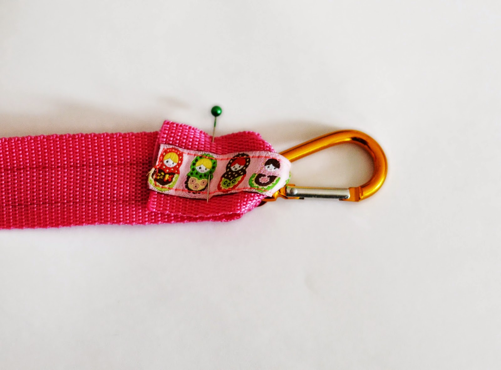 11. Fast fertig, jetzt fehlt nur noch der Karabiner am Ende des langen Bandes. Einfach durch den Karabiner stecken und dann wird das festgenäht.