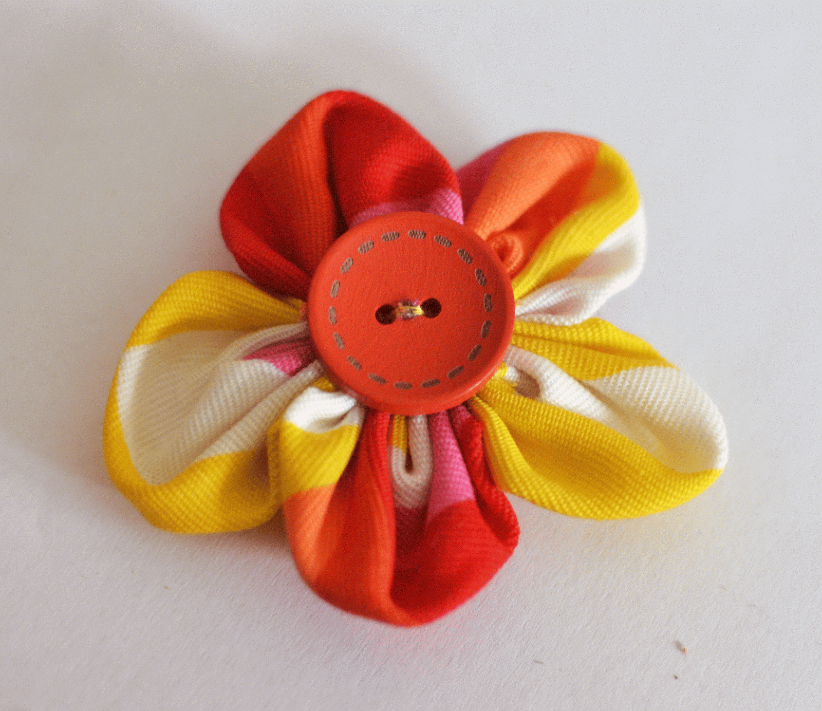 Die Blumen sind ganz schnell und einfach gemacht. Hierfür brauchst Du nur 5 Stoffquadrate ( wie man auf dem Bild sehen kann müssen die auch nicht sonderlich ordentlich geschnitten sein ), einen Knopf und Nadel und Faden.